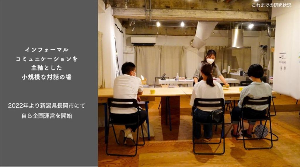 ⽇本デザイン学会72回春季研究発表⼤会にて、⾃⾝が企画運営する「インフォーマルコミュニケーションを主軸とした⼩規模な対話の場」に参加者が再来する諸要因や、場における「蓋然性のマネジメント」のあり⽅についての研究成果および今後の展望について⼝頭発表を⾏いました。